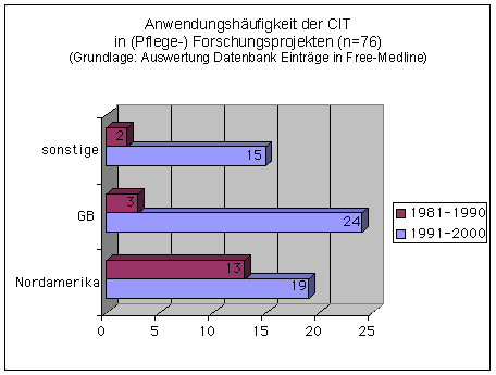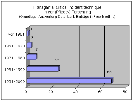 Aufgrund der Free-Medline Recherche wird deutlich, dass die Critical Incident Technique schon seit vielen Jahren auch in der Pflegeforschung als Methode genutzt wird. Allerdings beziehen sich alle Einträge auf Untersuchungen, die ihren Ursprung nicht in Deutschland haben. Wie nicht anders zu erwarten, wurde mittels der CIT zuerst im nordamerikanischen Raum im Rahmen von Pflegeforschungsaktivitäten gearbeitet. Schaut man aber auf die letzten zehn Jahre, so hat eine Verlagerung in den europäischen Raum stattgefunden. Allein in Großbritannien wurde in den letzten 10 Jahren 24 Arbeiten angeführt, in denen die CIT zum Einsatz kam.
